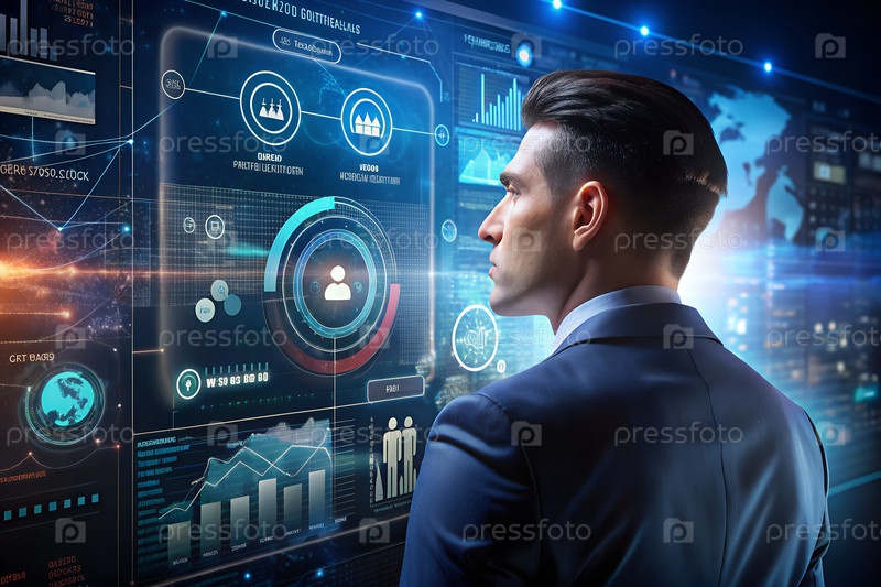 Стратегия цифрового маркетинга и таргетинг аудитории, концепция анализа данных.Человеческое взаимодействие с панелями управления аналитикой данных