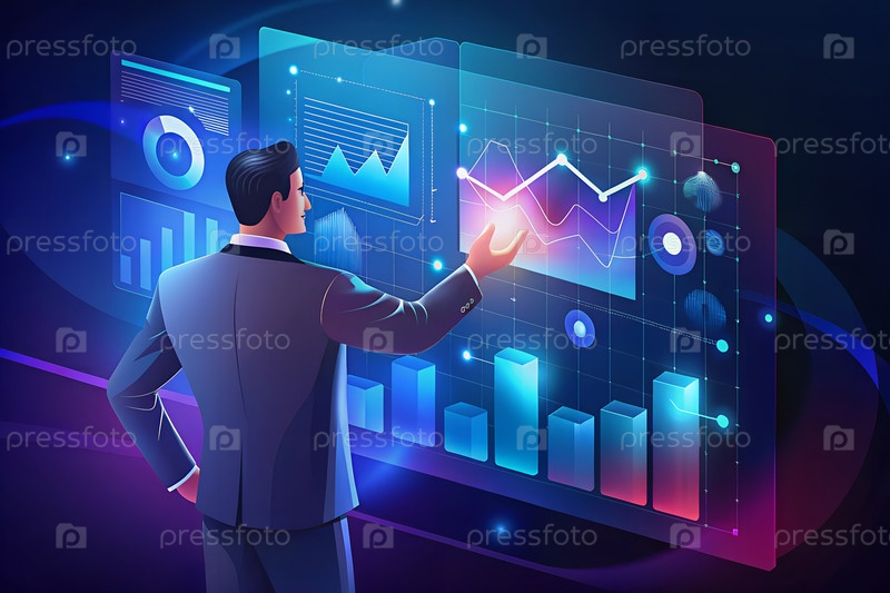 Стратегия цифрового маркетинга и таргетинг аудитории, концепция анализа данных.Человеческое взаимодействие с панелями управления аналитикой данных