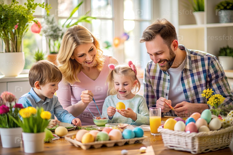 Счастливая семья с родителями и детьми, рисующими красочные пасхальные яйца вместе дома праздничная весенняя деятельность