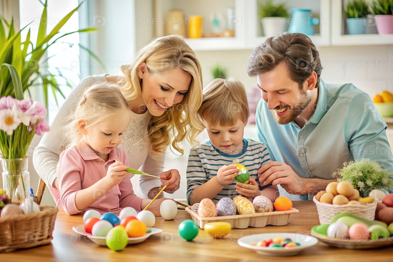 Счастливая семья с родителями и детьми, рисующими красочные пасхальные яйца вместе дома праздничная весенняя деятельность