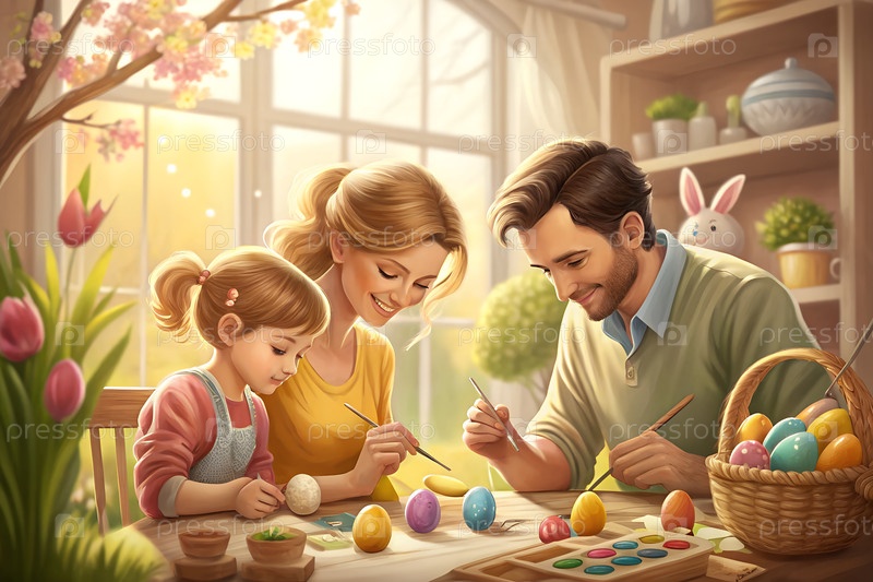 Счастливая семья с родителями и детьми, рисующими красочные пасхальные яйца вместе дома праздничная весенняя деятельность