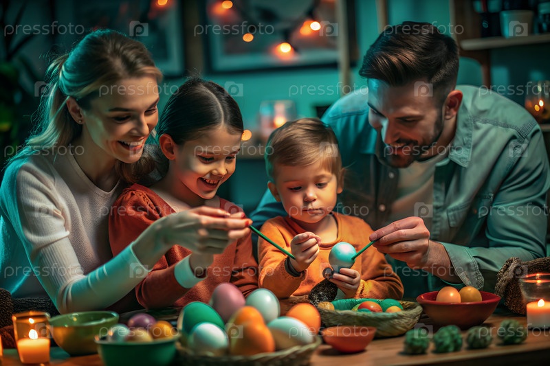 Счастливая семья с родителями и детьми, рисующими красочные пасхальные яйца вместе дома праздничная весенняя деятельность