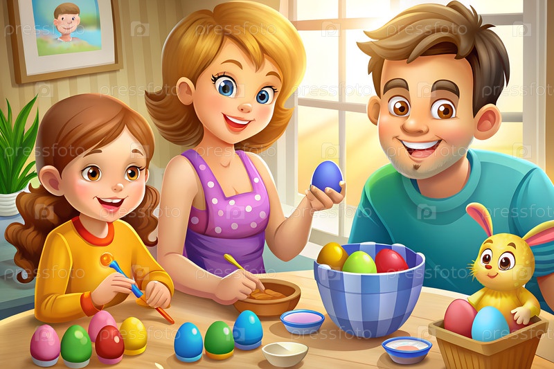 Счастливая семья с родителями и детьми, рисующими красочные пасхальные яйца вместе дома праздничная весенняя деятельность