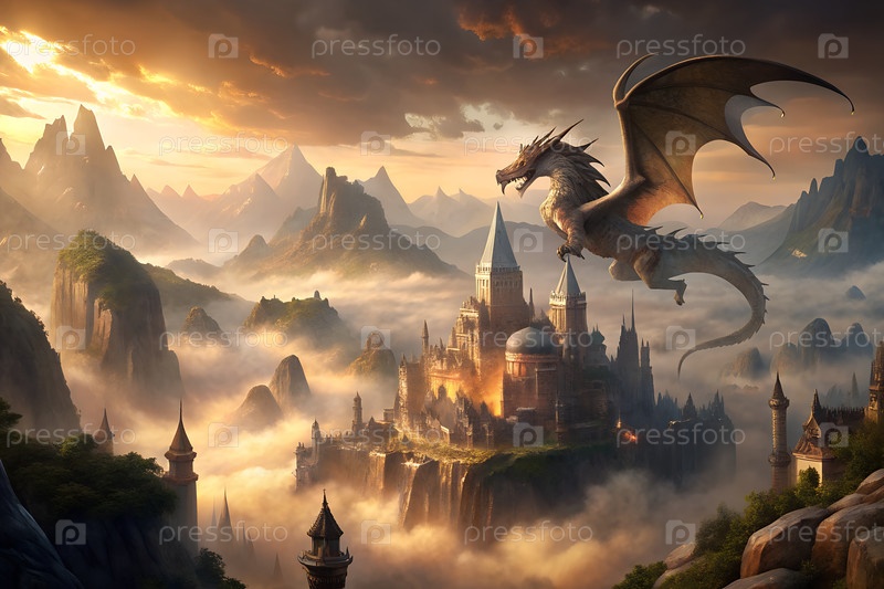 Фантастический дракон летит возле средневекового замка в туманных горах на закате, эпическая мифическая пейзажная сцена