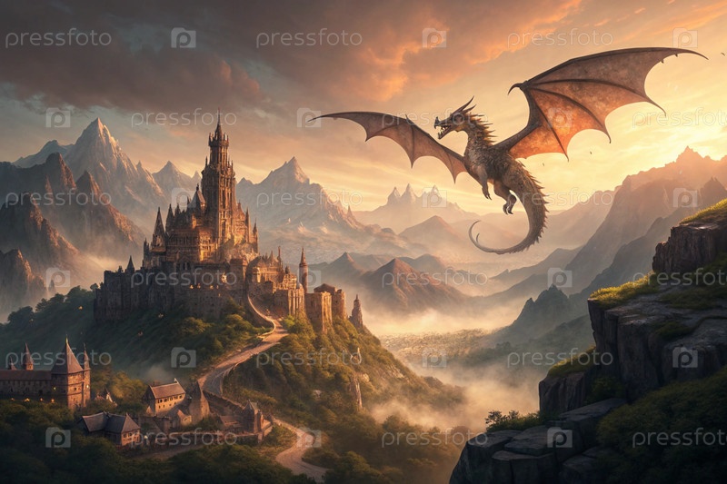 Фантастический дракон летит возле средневекового замка в туманных горах на закате, эпическая мифическая пейзажная сцена