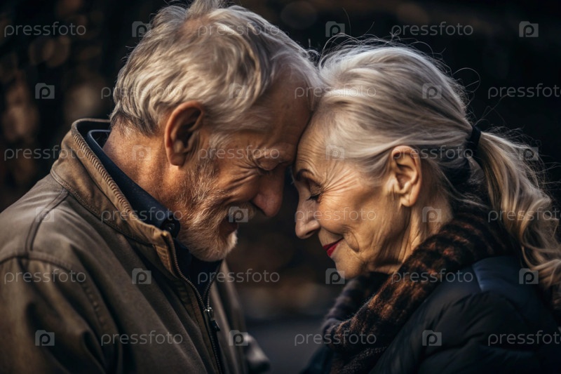 Любящая старшая пара, прикасающаяся к лбу и улыбаясь, близкий портрет пожилых партнеров, разделяющих нежный момент