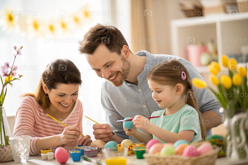 Счастливая семья с родителями и детьми, рисующими красочные пасхальные яйца вместе дома праздничная весенняя деятельность