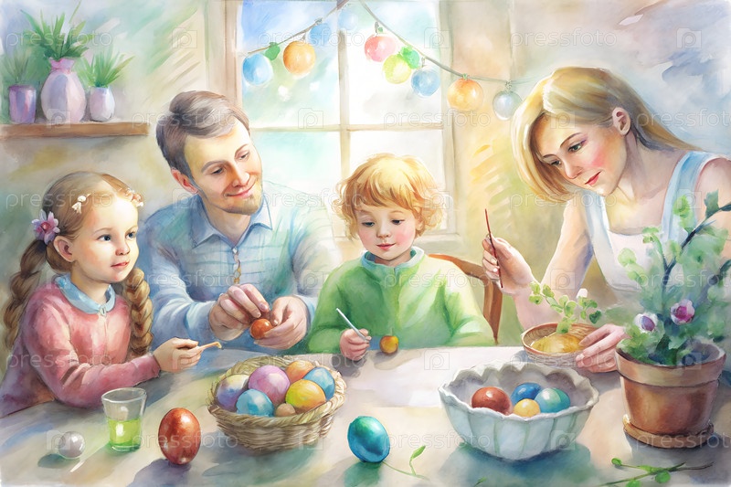 Счастливая семья с родителями и детьми, рисующими красочные пасхальные яйца вместе дома праздничная весенняя деятельность