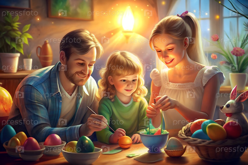 Счастливая семья с родителями и детьми, рисующими красочные пасхальные яйца вместе дома праздничная весенняя деятельность