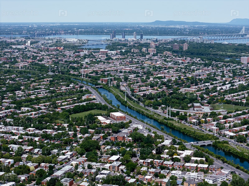 Вид с воздуха на район Верден, Лашинский канал и горизонт центра Монреаля летом