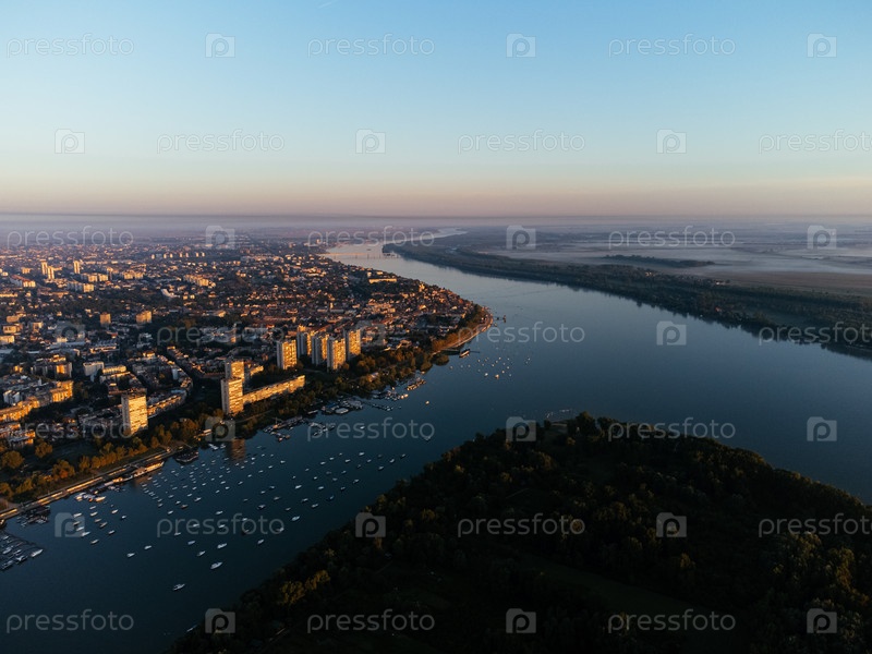 Вид на восход солнца с воздуха над городом Белград, изгиб реки и городской горизонт в золотом свете. g