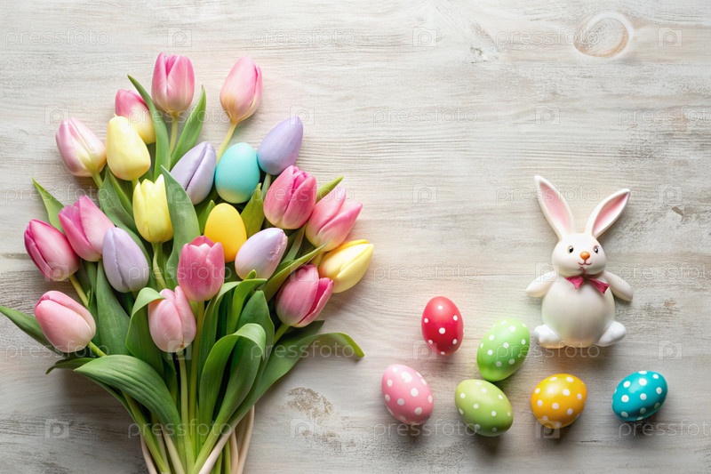 Пастельные пасхальные яйца, тюльпаны и милое украшение кролика на светлом фоне, весенние праздники плоская композиция. g