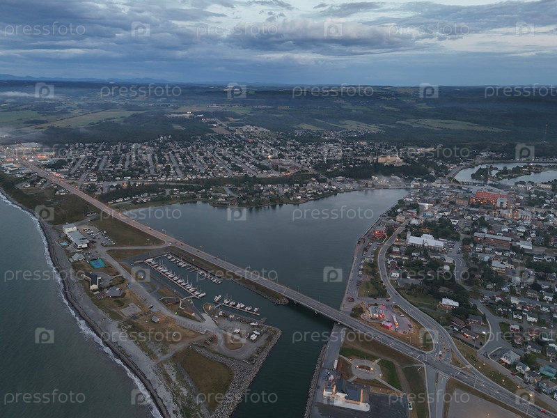 Вид из воздуха города Матане на закате с рекой, туманом, низкими облаками и городскими огнями вдоль реки Сент-Лоуренс, Квебек, Канада
