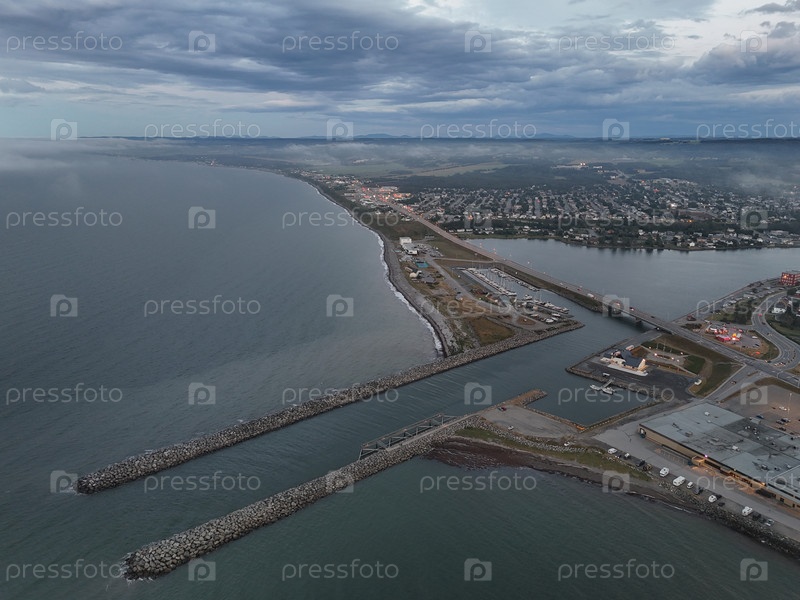 Вид из воздуха города Матане на закате с рекой, туманом, низкими облаками и городскими огнями вдоль реки Сент-Лоуренс, Квебек, Канада