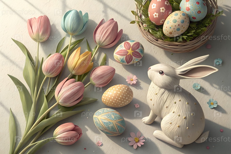 Пастельные пасхальные яйца, тюльпаны и милое украшение кролика на светлом фоне, весенние праздники плоская композиция. g