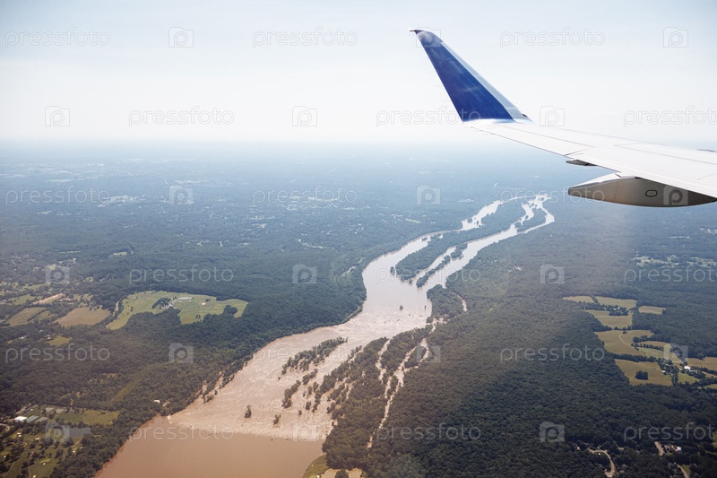 Вид с воздуха из крыла самолета на перекрестке пригородного шоссе с трафиком и районами в Вашингтоне, США. g