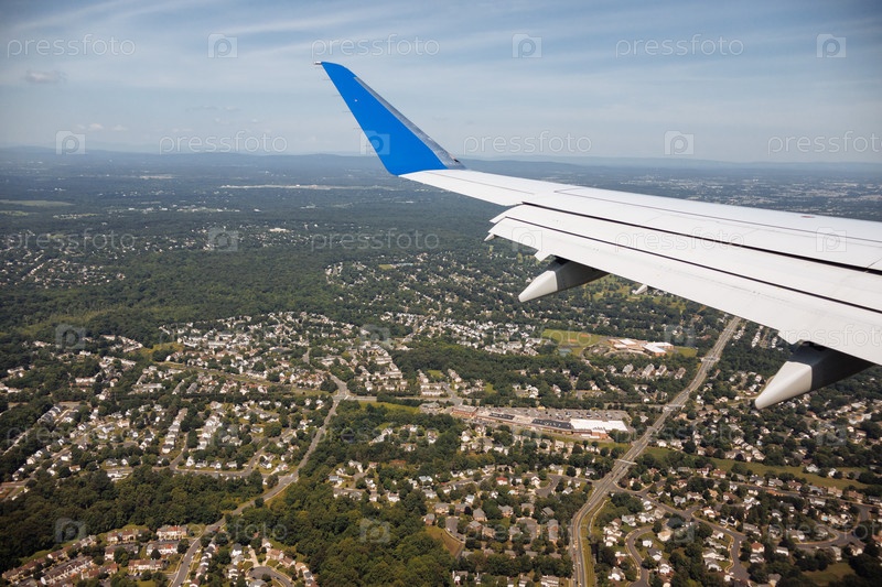 Вид с воздуха из крыла самолета на перекрестке пригородного шоссе с трафиком и районами в Вашингтоне, США. g