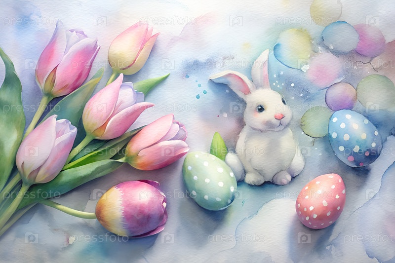 Пастельные пасхальные яйца, тюльпаны и милое украшение кролика на светлом фоне, весенние праздники плоская композиция. g