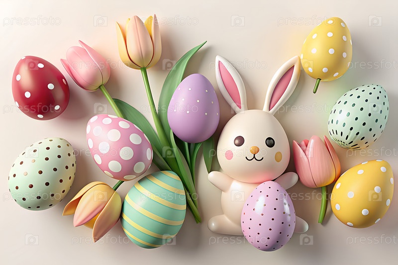 Пастельные пасхальные яйца, тюльпаны и милое украшение кролика на светлом фоне, весенние праздники плоская композиция. g