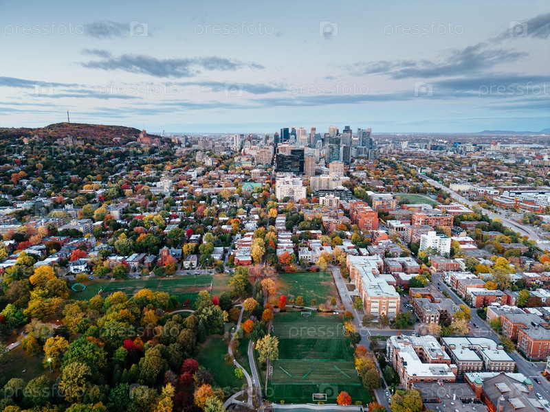 Вид с воздуха горизонта Монреаля с трафиком на шоссе и красочными осенними деревьями при закате, Квебек, Канада. g
