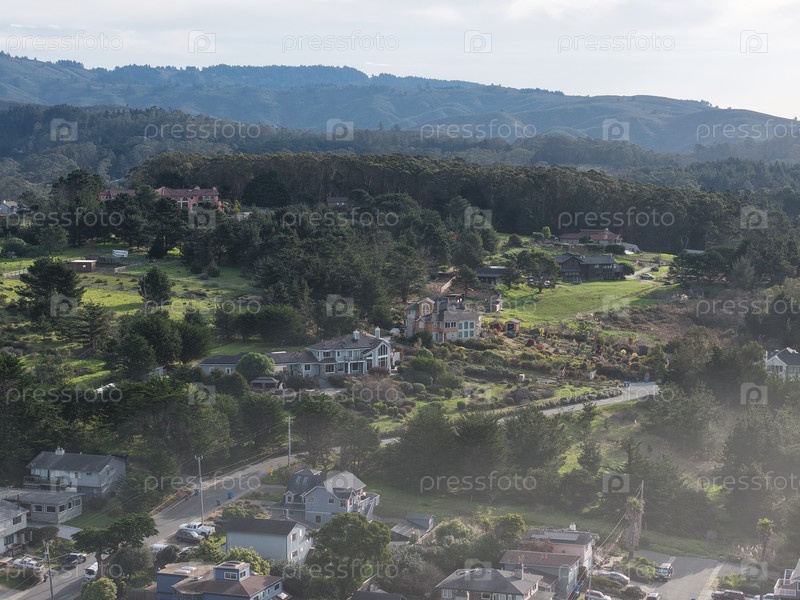 Туманное Тихоокеанское побережье с волнами, лесистыми скалами и прибрежной дорогой со строительными машинами и домами. g