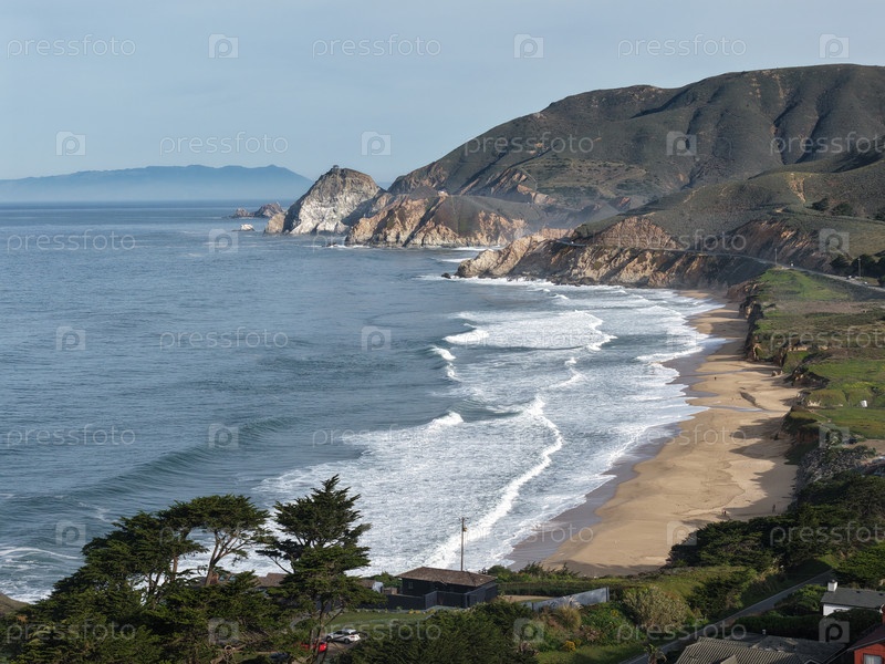 Драматическая тихоокеанская береговая линия с скалами, песчаным пляжем и океанскими волнами вдоль Калифорнийского побережья