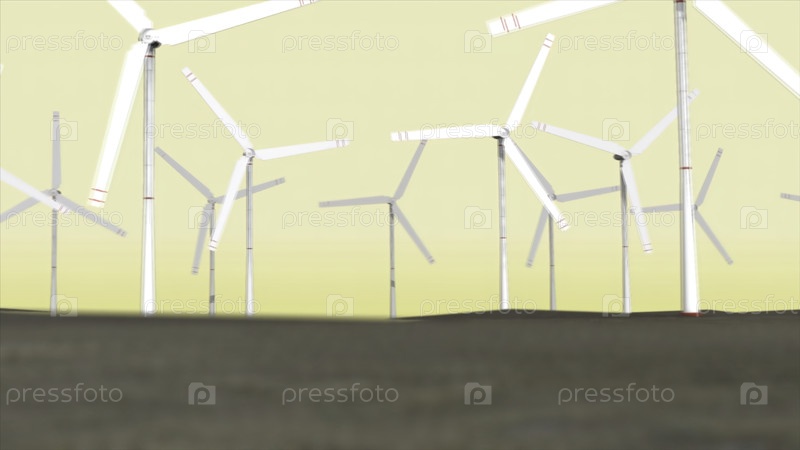 Абстрактный ландшафт с полем, заходящее небо и производство электроэнергии зеленой энергией. Анимация. Ветряные мельницы с вращающимися лопатками на бесконечном поле, концепция чистой энергетики