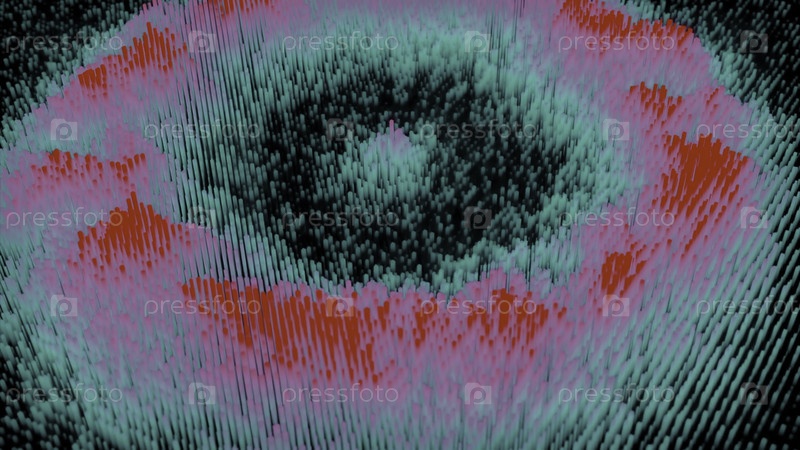 Цветные волновые потоки на поверхности кибертекстуры. Дизайн. Волна круглых точек на поверхности киберполя. Кибертекстура с круговыми цветными волнами