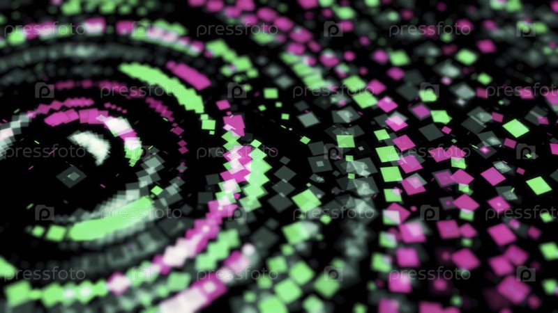 Абстрактные яркие неоновые круги, состоящие из маленьких многоцветных геометрических фигур и движущихся хаотично в темноте