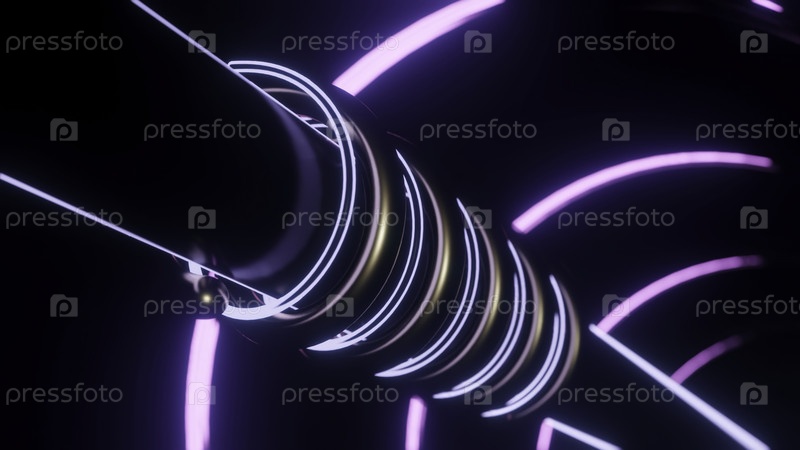 Светящиеся линии вращаются вокруг трубы. Дизайн. Металлическая труба с движущимися спиралями неоновых и металлических труб. Механическая часть с движущимися частями и вращающимися неонными трубами