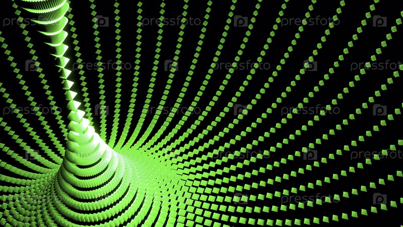 Абстрактный фон движения вращающихся сфер, образующих водоворот, бесшовную петлю. Дизайн. Красивый вихрь или ураган на черном фоне