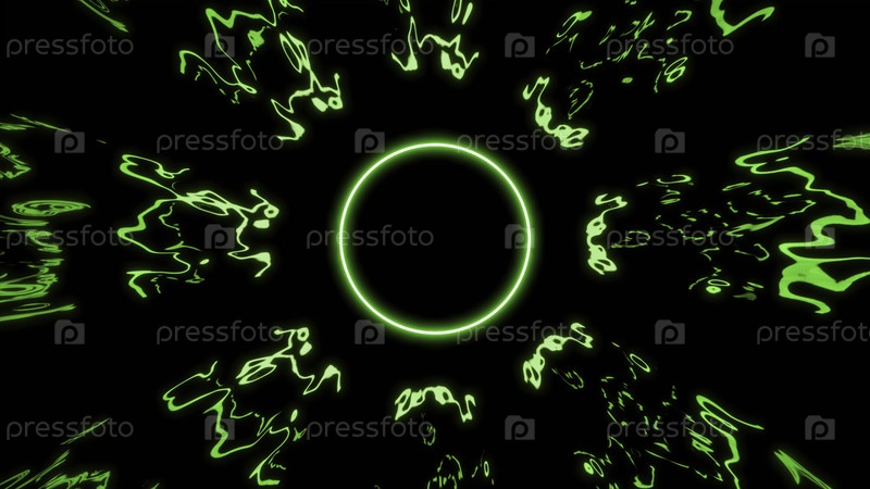 Анимация с светящимися электронными волнами вокруг кольца. Дизайн. Неонное кольцо со пучками электронных волн на черном фоне. Движение искаженных линий от кольца в центре