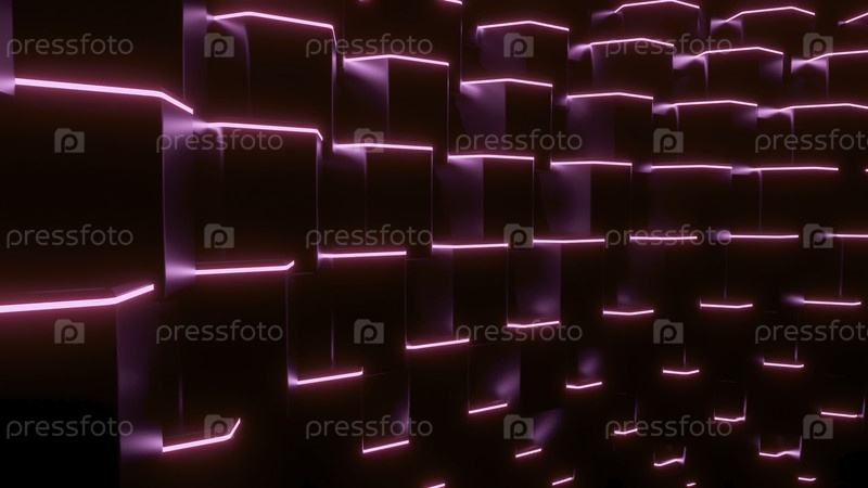 Ряд квадратов с неоновыми линиями движется в потоке. Дизайн. 3D-кубы двигаются волновым током. Черные квадраты с неонными линиями движутся волновым течением