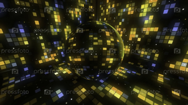 Красивый дискотечный шар, вращающийся внутри ночного клуба, концепция веселья и танцев.Движение.Желто-голубое мерцание светящихся квадратных огней, бесшовная петля