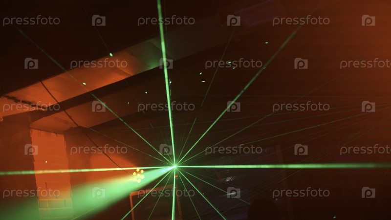 Яркие лазерные линии в клубе ночью. Клип. Площадь для танцев в ночном клубе с зелеными лазерами. Линии ярких лазеров сияют в оживленном ночном клубе