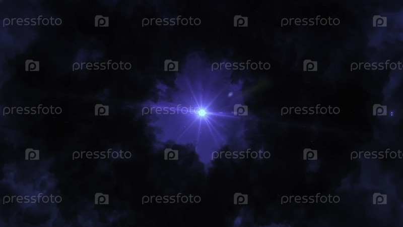 Драматические темные яркие пушистые облака, летящие вокруг одинокой светящейся звезды. Абстрактное красивое небо темно-синего цвета, снизу вид абстрактной природы ночью