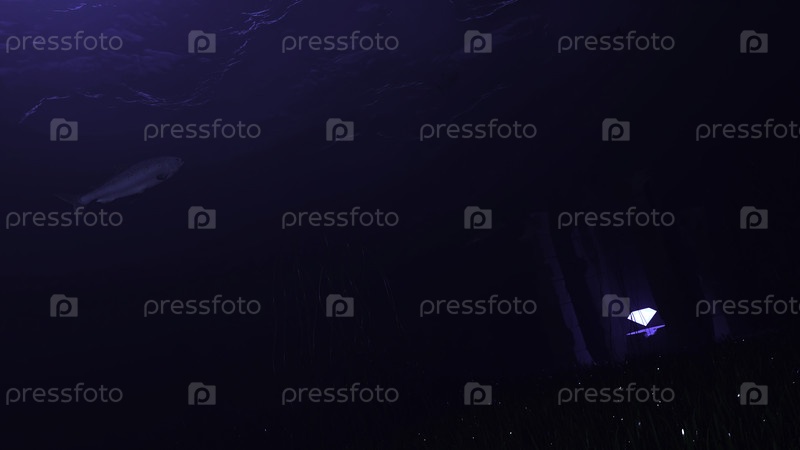 Темное подводное пространство с рыбой.Дизайн.Натуралистическая 3D-анимация темного подводного мира.Рыбы плавают в тёмной морской воде