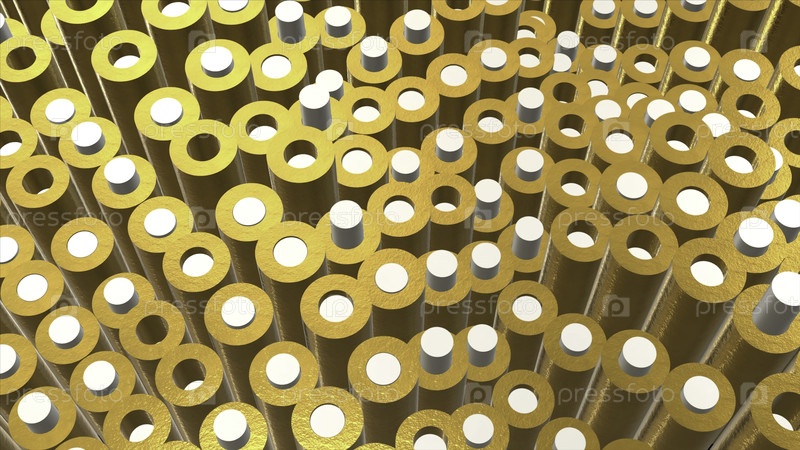 Яркая абстракция. Движение. Синие и золотые кольца, через которые проходят маленькие палочки, которые по очереди перемещаются вперед-назад