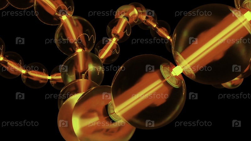 Близкий снимок стеклянной гирлянда с прозрачными лампочками, движущимися в бесконечной линии. Дизайн. Соединенные стеклянные лампочки с теплым слабым светом, движущимся изолированным на черном фоне