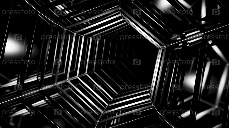 Экспериментируйте с футуристическим черным шестиугольным туннелем, в котором есть потрясающие отражательные поверхности