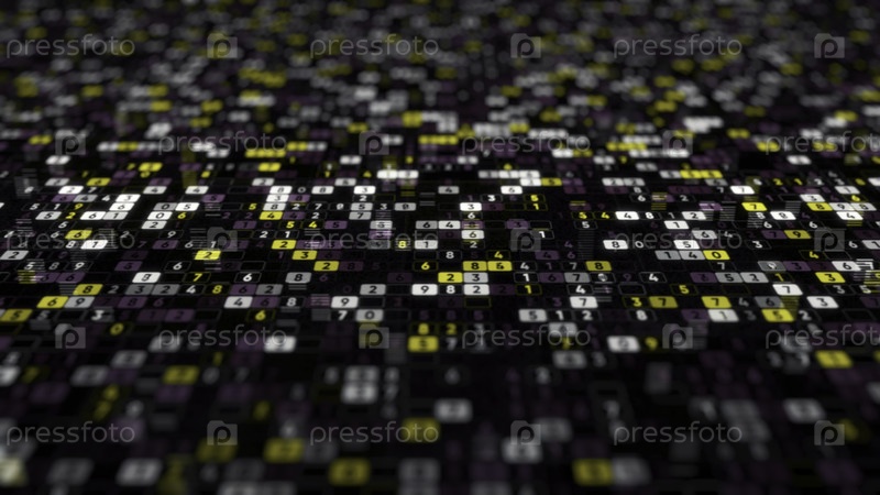 Абстрактная анимация с большим количеством цифр, изменяющих свои значения на черном фоне. Анимация. Данные и числовые значения проходят через киберпространство