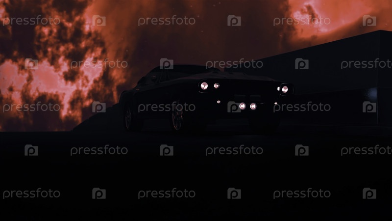 Абстрактная темная улица и вождение легкового автомобиля на красном апокалиптическом фоне неба. Дизайн. Красивый автомобиль, быстро движущийся вдоль забора ночью на облачном фоне ада