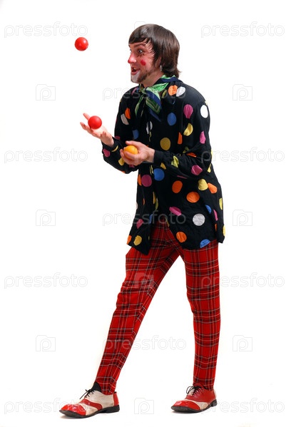 Клоун жонглирует мячами, на белом фоне