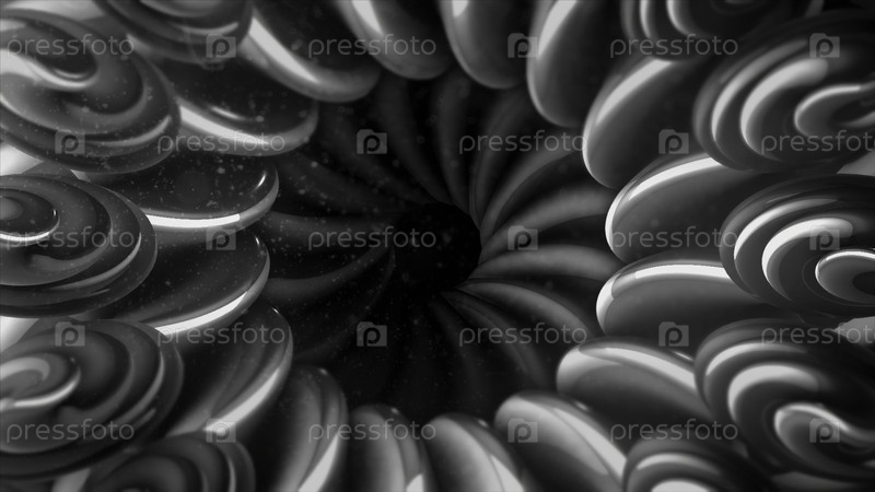 Серые монохромные цветочные спиральные формы в цикличном анимированном фоне. Движение. Трансформация черно-белых фракталов