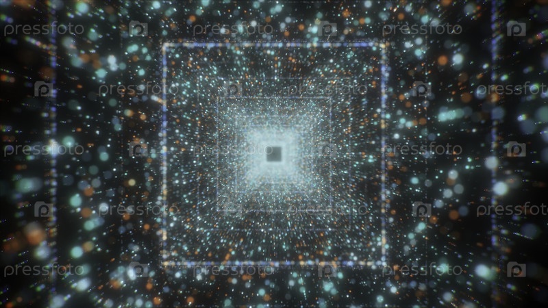 Синий яркий фон. Движение. Яркие геометрические фигуры в абстракции создают туннель и тянут его на свой путь, рядом с которым летают яркие звезды и линии