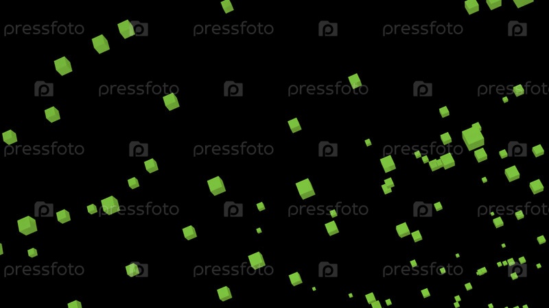 Движущийся поток пульсирующих 3D квадратов. Дизайн. Многие 3D квадраты, движущиеся в потоке. 3D квадраты летают в пространстве на черном фоне