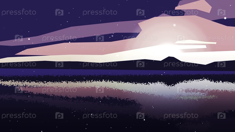 Декоративный морской пейзаж с красочным отражением цветов захода солнца на поверхности моря в минимальном стиле, абстрактный фон природы