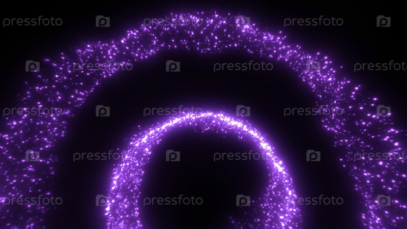 Абстрактные мерцающие частицы, создающие форму дуг и кругов. Движение. Колебающиеся светящиеся точки на черном фоне