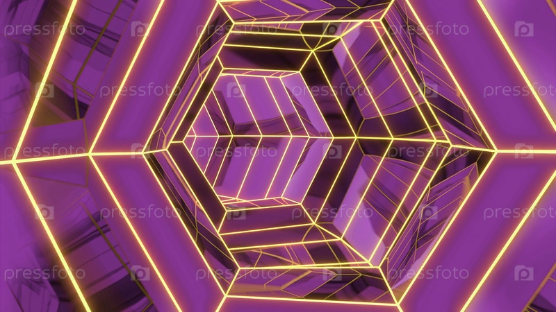 Движение по мигающему цветному туннелю. Дизайн. Яркий 3D-тунел с геометрическими стеклянными стенами и неоновыми линиями. Погрузитесь в яркий психоделический тоннель