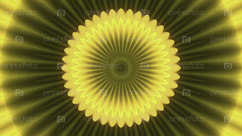 Абстрактный цветочный калейдоскопический рисунок желтого цвета, бесшовная петля.Движение.Круги подсолнечника с преобразующимися лепестками